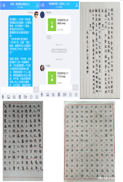 在微信、QQ课程群展示学生的朗读经典音频、历史情境对话视频、硬笔书法作品等,加强互动,分享学习收获,体验创作的成功感。通过对作品在超星学习通上评分,吸引更多同学参与,使评价具有公正性、客观性。在线上,“红色资本家”答记者问,“记者”和“荣毅仁”穿越回溯到1956年,对话有板有眼。王尔琢的“一封红色家书”同学们争相传抄,展示佳作。未来得及展示作品的同学对下一堂《概论》课充满了期待,希望热评拿高分。