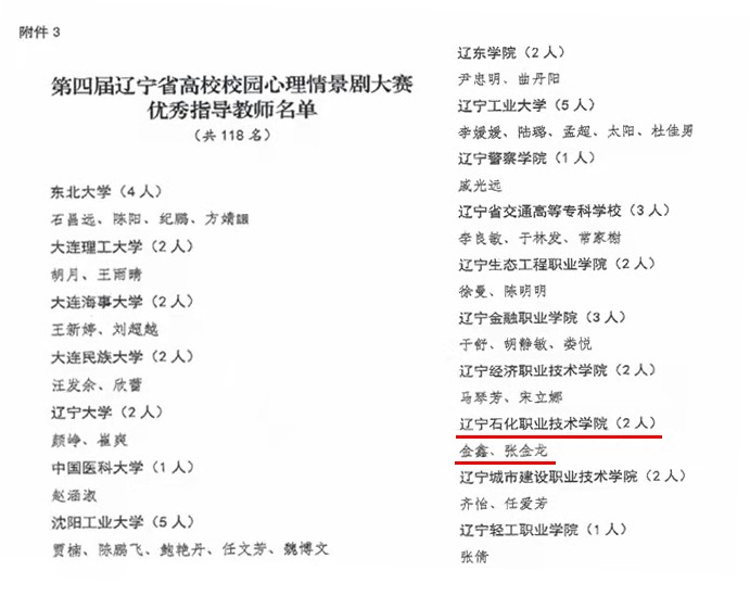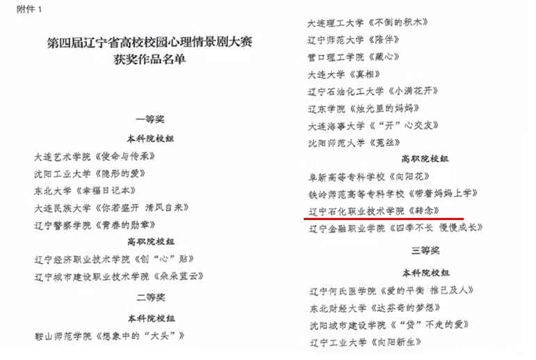近日,《辽宁省教育厅办公室关于公布辽宁省高校心理健康教育名师工作室建设名单和培育名单的通知》(辽教办〔2021〕329号)和《辽宁省教育厅办公室关于公布第四届辽宁省高校校园心理情景剧大赛获奖名单的通知》(辽教办〔2021〕330号)同期而至,我院金鑫老师申报的“高职院校师生心理服务专业化能力建设”为主题的心理工作室入选首批“辽宁省高校心理健康教育名师工作室”建设名单,是唯一一所高职院校建设单位,由学院报送的校园心理剧作品《转念》获得由辽宁省教育厅主办的第四届辽宁省高校校园心理情景剧大赛二等奖,学院荣获优秀组织奖,两名教师被评为优秀指导教师。这是我院在心理健康教育工作中取得的多项最新成果。